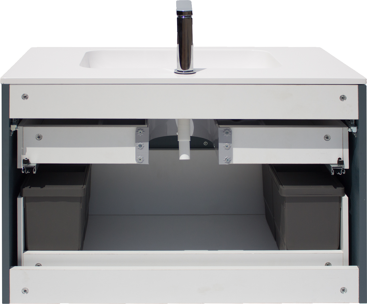 Дана модель комплектується раковиною зі штучного каменю серії Della шириною 80 см від українського виробника - компанії Miraggio. Раковина має отвір для монтажу змішувача та оснащена переливним твором. Також, в комплекті дизайнерські ручки від компанії Furnipart (Данія), сортер у нижню шухляду бренду Gollinucci (Італія), навіси Camar (Італія). Окремо можна доукомплектувати додатковим сортером у нижню шухляду.